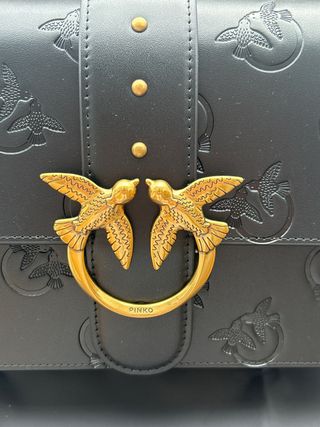 Elegante borsa Pinko in pelle nera, caratterizzata da un design con logo a uccelli in rilievo e dettagli dorati. - Logo iconico a forma di uccelli. - Chiusura con fibbia dorata. - Tracolla a catena dorata. - Finiture metalliche color oro.