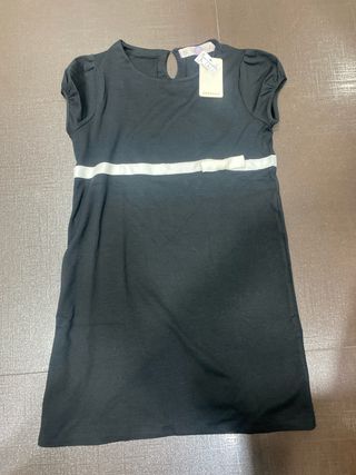 Vestito corto nero Zara con dettaglio di nastro bianco in vita e fiocco. - Maniche corte a sbuffo. - Scollo rotondo con apertura sul retro. - Nastro decorativo in vita.