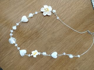 Collana lunga realizzata a mano, un pezzo unico. - Decorata con perle trasparenti e bianche. - Charm a forma di cuore. - Dettagli floreali. - Chiusura a moschettone.