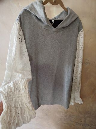 Comoda felpa da donna con un design moderno. - Cappuccio integrato. - Maniche lunghe in pizzo bianco. - Polsini e fondo felpa elasticizzati.