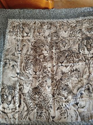 Elegante foulard da donna con una vivace stampa di felini. - Motivo con leoni, tigri e ghepardi. - Bordo decorato con motivo animalier.