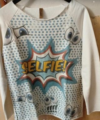 Felpa da donna con stampa divertente. - Maniche lunghe. - Girocollo. - Stampa a tema Selfie con occhi e pois.