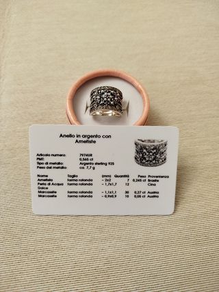 Anello in argento sterling 925 con ametiste e perle d'acqua dolce. - Peso metallo: ca. 7,7 g - Ametista: 7 pezzi, forma rotonda, 2x2 mm, 0,245 ct - Perla d'acqua: 12 pezzi, forma rotonda, ~1,7x1,7 mm - Marcassite: 30 pezzi, forma rotonda, ~1,1x1,1 mm, 0,27 ct - Marcassite: 10 pezzi, forma rotonda, ~0,9x0,9 mm, 0,05 ct