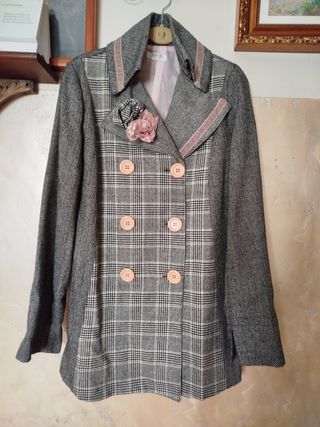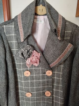 Elegante cappottino da donna, perfetto per completare un look sofisticato. - Fantasia a quadri. - Dettagli in velluto rosa. - Fiore decorativo applicato. - Bottoni a contrasto.