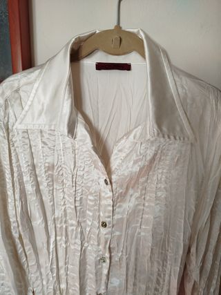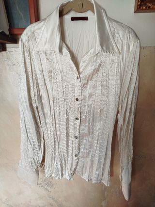 Elegante camicia da donna con un design raffinato. - Tessuto lucido e leggermente stropicciato. - Bottoni decorativi sul davanti. - Colletto classico.