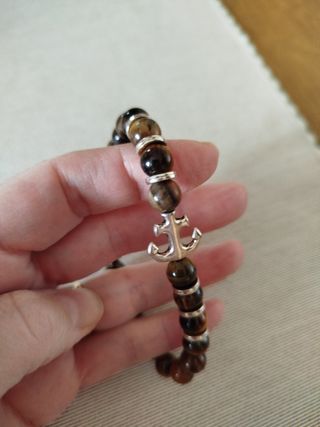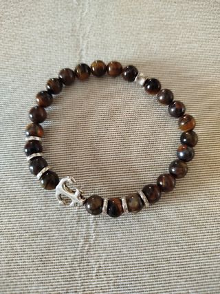 Elegante braccialetto elastico con pietre occhio di tigre e un ciondolo a forma di ancora. - Pietre naturali occhio di tigre. - Ciondolo a forma di ancora in metallo. - Distanziatori metallici tra le pietre.