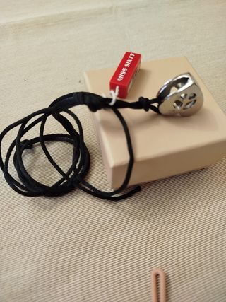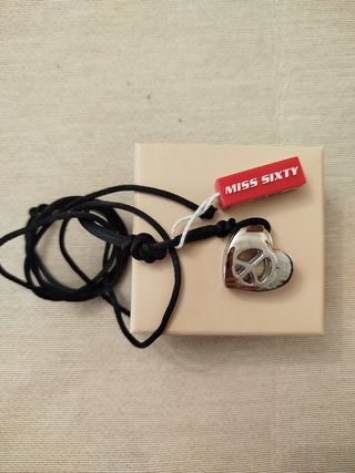 Collana con pendente a forma di cuore, firmata Miss Sixty. Il cuore è in argento e il filo è nero. - Pendente a forma di cuore con simbolo pace. - Filo nero regolabile.