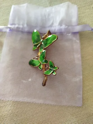 Deliziosa spilla a forma di farfalle, utilizzabile anche come ciondolo. - Design con farfalle stilizzate. - Dettagli in smalto verde brillante. - Finitura color oro.