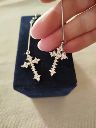 Eleganti orecchini pendenti con un design a croce impreziosito da piccole pietre luminose. - Lunghezza pendente. - Dettagli a forma di croce. - Incastonatura di pietre brillanti.