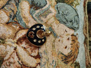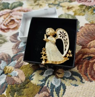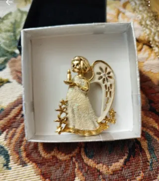 Deliziosa spilla a forma di angelo, un pezzo vintage che aggiunge un tocco di eleganza. - Dettagli dorati e bianchi. - Design con candela e stelle. - Ideale per collezionisti o come regalo speciale.