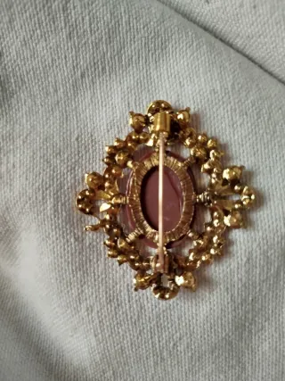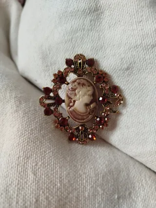 Elegante spilla in stile vintage con un cammeo raffigurante un profilo di dama antica. La montatura è impreziosita da cristalli scintillanti. - Design ovale con dettagli floreali. - Cristalli di colore rosso intenso. - Finitura color oro.
