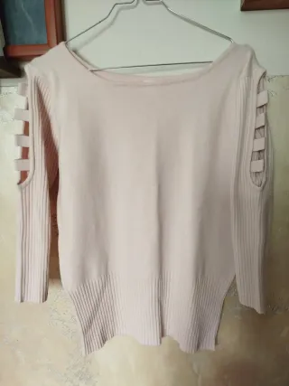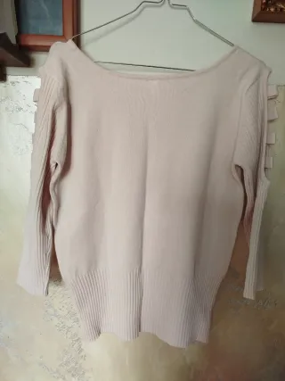 Maglioncino da donna in una delicata tonalità di rosa. - Maniche lunghe con dettagli a spacchi. - Collo rotondo. - Fondo e polsini a costine.