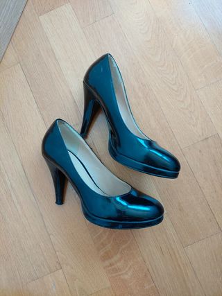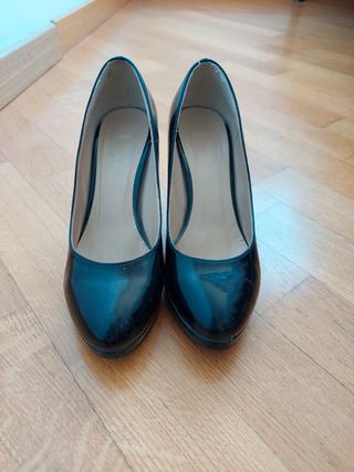 Eleganti scarpe décolleté con una finitura lucida che aggiunge un tocco di classe. - Tacco alto e sottile. - Finitura verniciata. - Color nero lucido - Misura 37 - Tacco 9 cm Indossate poche volte #décolleté #tacchialti #cerimonia