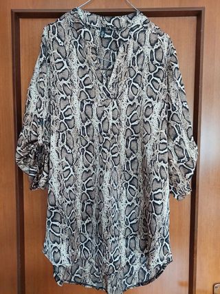 Blusa lunga con un design morbido e confortevole. - Fantasia animalier. - Maniche lunghe arricciate. - Scollo a V. - Veste morbida - Larghezza da ascella ad ascella:54 cm circa - Lunghezza blusa fronte (da collo fin giù): 74 cm circa - Lunghezza blusa retro (da collo fin giù): 86 cm circa - Made In Italia - Mai indossato #premaman #gravidanzaestate #oversize #comodità