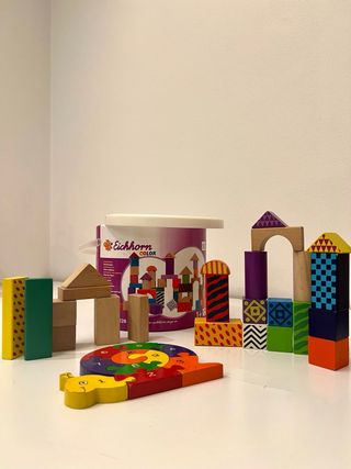 Set di blocchi da costruzione in legno Eichhorn COLOR, ideali per stimolare la creatività. - Materiale: legno. - Design colorato e fantasioso. - Include vari blocchi per creare diverse strutture.