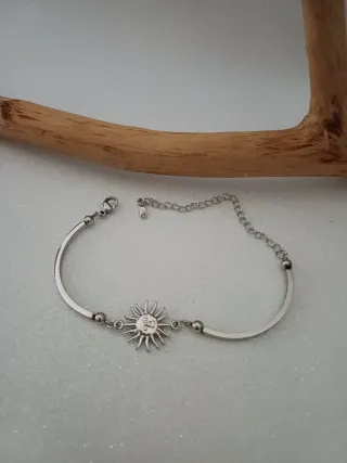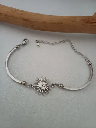 Elegante bracciale nuovo in acciaio con un ciondolo a forma di sole. - Design a forma di sole stilizzato. - Chiusura a moschettone con catenella regolabile. - Perline decorative lungo il bracciale.