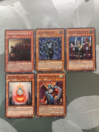 Set di 5 carte Yu-Gi-Oh! in italiano. - Inceneritore Infernale (ATK/2800 DEF/1800) - Lucio Nero LV4 (ATK/1000 DEF/300) - Guardia del Corpo della Regina (ATK/1700 DEF/1200) - Origine Neo Flamvell (ATK/500 DEF/200) - Destino Koa'ki Meiru (ATK/1700 DEF/800)