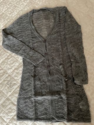 Cardigan lungo con un design aperto e dettagli a onde. Presenta due tasche frontali e chiusura con bottoni. - Lunghezza fino a metà coscia - Tessuto leggero e caldo in mohair - Logo Gaudì applicato su una tasca - Taglia 42 italiana