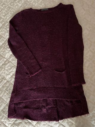 Maglione lungo in maglia color borgogna. Presenta un design con tasche applicate sul davanti e più lungo sul retro - taglia 42 italiana - Scollo rotondo - Maniche lunghe - lunghezza metà coscia