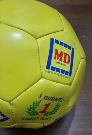 Pallone da calcio di colore giallo con logo MD Discount. - Logo MD Discount stampato su più pannelli. - Design a pannelli esagonali e pentagonali.