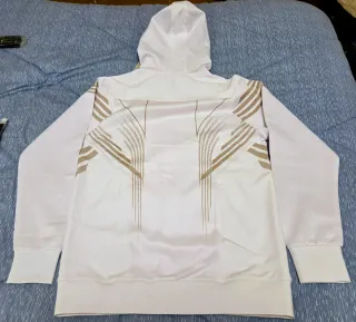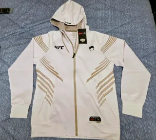Giacca con cappuccio Venum UFC di colore bianco. Presenta un design moderno con dettagli a contrasto sulle maniche e sul petto. - Logo UFC sul petto. - Logo Venum sul petto. - Cappuccio con fodera interna. - Zip frontale. - Tasche laterali.