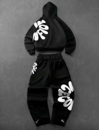 Pantaloni neri con un design ricamato sul lato. - Ricamo bianco con scritta. - Vita elasticizzata con coulisse. - Tasche laterali.