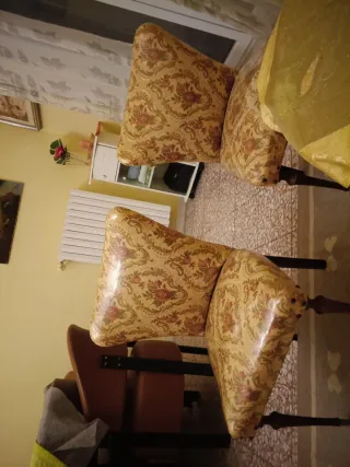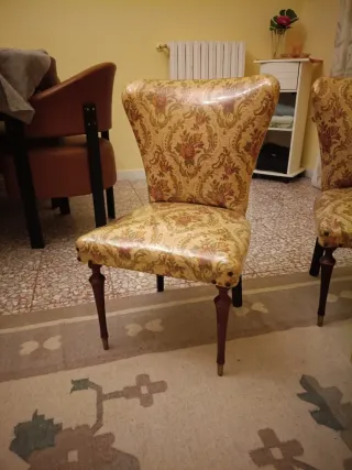 Set di sedie vintage risalenti agli anni '60, con un tavolino rotondo in vetro. Perfette per aggiungere un tocco retrò alla tua casa. - Design unico. - Gambe in legno tornito. - Rivestimento floreale colorato.