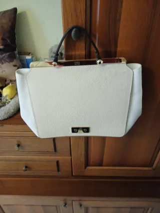 Borsa Furla in pelle bianca, con chiusura a scatto dorata. - Dettagli in metallo dorato. - Manici in pelle nera. - Logo Furla impresso all'interno.