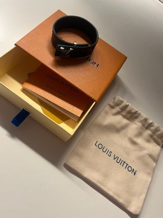 Elegante bracciale Louis Vuitton in pelle nera con dettagli dorati. - Design con motivo Monogram inciso. - Chiusura a fibbia con logo LV. - Include scatola e dustbag.