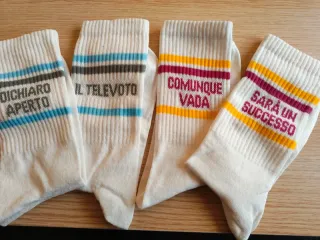 Set due confezioni di calzini decorati a tema Festival di Sanremo. Da collezione. Tg unica 38-42. "Comunque vada sarà un successo" "Dichiaro aperto il televoto" Nuovi nella loro confezione. Aperti solo per fare foto.