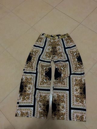 Pantaloni lunghi da bambina con una fantasia barocca dorata su sfondo nero e bianco. Vita elasticizzata. - Fantasia barocca - Vita elasticizzata