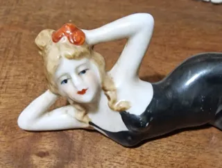Piccola statuetta di porcellana raffigurante una donna in costume da bagno. - Dettagli dipinti a mano. - Posizione sdraiata. - Accessorio rosso tra i capelli.
