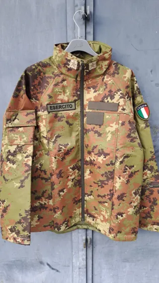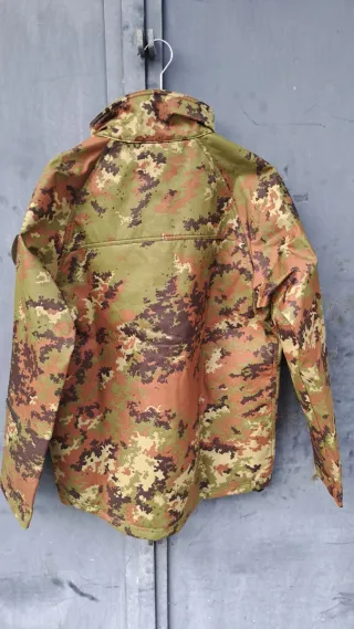 Giacca militare con fantasia mimetica in tonalità verdi e marroni. Presenta un collo alto e chiusura frontale. - Tessuto antivento. - Tessuto impermeabile. - Fantasia mimetica. - Collo alto.
