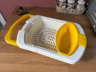 Scolapiatti in plastica con manico e vaschetta estraibile. - Design compatto e funzionale. - Colore bianco e giallo vivace. - Ideale per ogni cucina. - Ideale anche per campeggio - Dimensioni esterne 29,5 x 43 cm