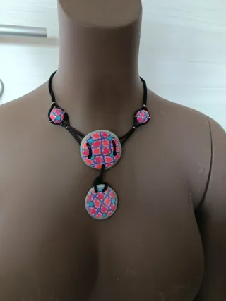 Parure formata da collana e orecchini fatti a mano in pasta polimerica. Collana costituita da doppio cordoncino nero e dettagliato fantasia. Orecchini a lobo con chiusura a farfallina. Pezzi unici, mai riprodotti.