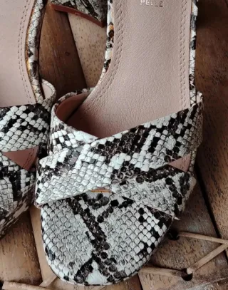 Eleganti sandali da donna con fantasia pitonata. - Tomaia in ecopelle effetto pitone. - Cinturino alla caviglia con chiusura a fibbia. - Tacco largo e comodo.