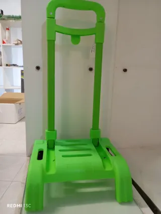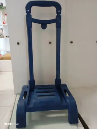 Pratico carrello universale per trasporto di zaini e borse, manico regolabile in altezza di alluminio, disponibile nei colori blu e verde. Richiudibile.