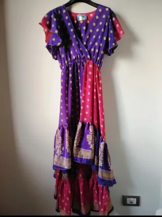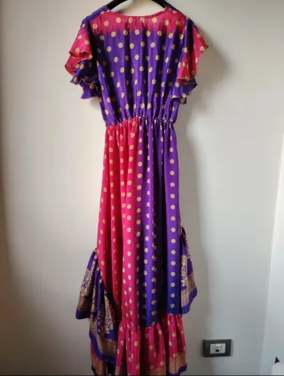 Abito lungo con fantasia a pois e balze. - Maniche corte a volant. - Scollo a V. - Vita elasticizzata. - Lunghezza asimmetrica con balze. - Dettagli floreali sui bordi.