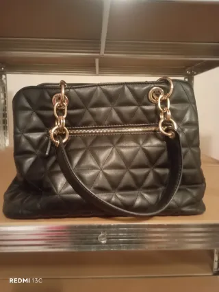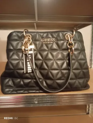 Elegante borsa Guess in pelle nera, con una bellissima trapuntatura a rombi che le conferisce un look sofisticato. Misure: lunghezza cm 35 altezza cm 25, profondità cm 14 - Dettagli in metallo dorato. - Logo Guess frontale. - Manici in pelle. - Tracolla removibile.