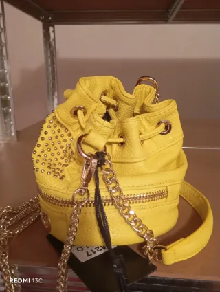 Elegante borsetta a secchiello firmata Giò Cellini, perfetta per aggiungere un tocco di stile. - Dettagli con borchie dorate. - Tracolla a catena dorata. - Chiusura con coulisse. - Anelli metallici decorativi sul fondo.