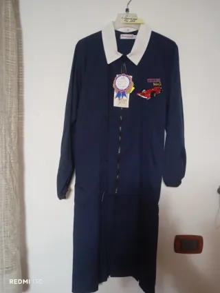 Grembiule da bambino Ambrosino, taglia 110. Ideale per la scuola o attività creative. - Colore blu scuro. - Collo bianco. - Chiusura con zip. - Ricamo THE KING MOTOR CO. con auto da corsa rossa sul petto. - Etichetta con dettagli del prodotto.