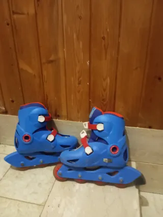 Pattini in linea per bambini, colore blu con dettagli rossi. - Chiusura con velcro e fibbia. - Ruote rosse. - Taglia regolabile.