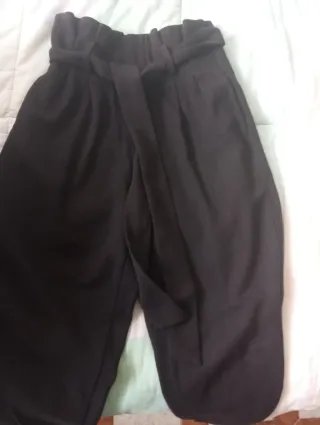 Pantaloni eleganti neri con cintura. - Vita alta con elastico e cintura annodabile. - Gamba ampia e morbida. - Tessuto leggero e fluido.
