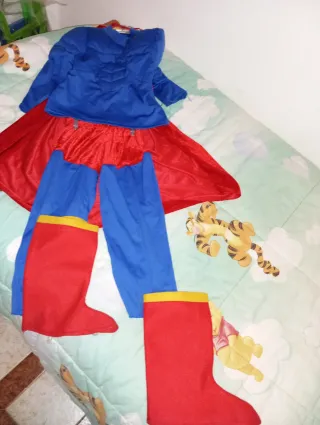 Costume da supereroe Spiderman per bambino, completo di tutti gli accessori per un travestimento completo. - Include mantello rosso. - Pantaloni blu e rossi con copristivali rossi. - Maglia blu con dettagli imbottitura per muscoli Taglia 3 / 4 anni bambino Come nuovo senza difetti tolgo perché ormai troppo piccolo