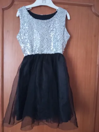 Elegante vestito per bambina, perfetto per occasioni speciali. - Corpetto interamente ricoperto di paillettes argentate. - Gonna in tulle nero a balze. - Senza maniche.