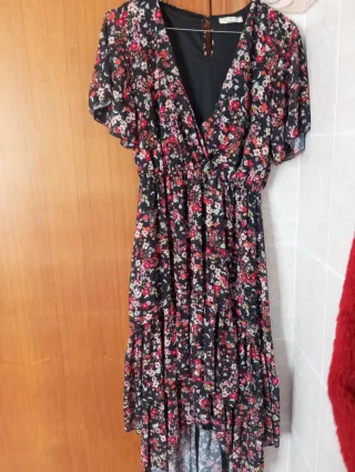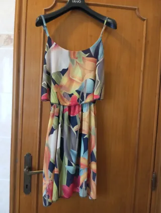 Vestito estivo con una stampa floreale vivace e colorata. Perfetto per le giornate di sole. - Tessuto leggero e arioso. - Spalline sottili. - Lunghezza al ginocchio. Come nuovo senza nessun difetto