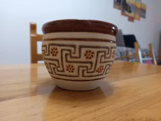 Elegante vaso decorativo con un motivo geometrico e floreale. - Motivo geometrico a greca. - Dettagli floreali marroni. - Bordatura superiore marrone.