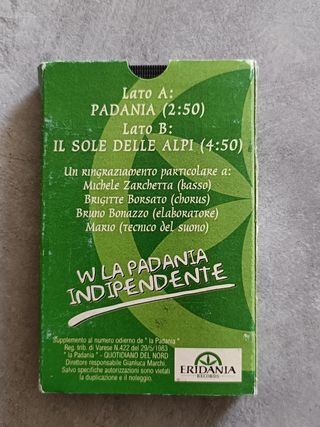 Radio cassetta con copertina raffigurante Va' Pensiero di Giuseppe Verdi e Sempre Avanti di Sergio Borsato. - La copertina mostra una roccia con la scritta IO AMO LA PADANIA e il simbolo del Sole delle Alpi.