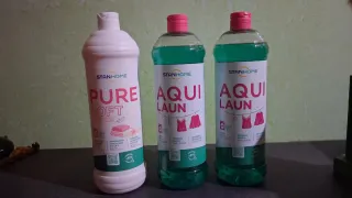 Lotto di 3 prodotti Stanhome. - 1 flacone Pure Soft ammorbidente concentrato. - 2 flaconi Aqui Laun detersivo liquido per capi delicati.
