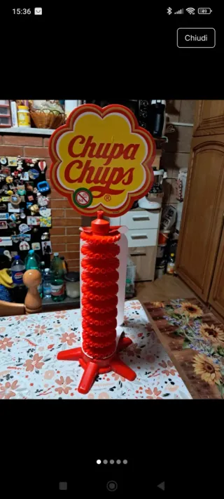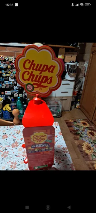 Espositore da banco Chupa Chups, ideale per caramelle e lecca-lecca. - Design a forma di fiore con logo Chupa Chups. - Struttura rossa con più livelli per esporre i prodotti. - Base stabile a stella.